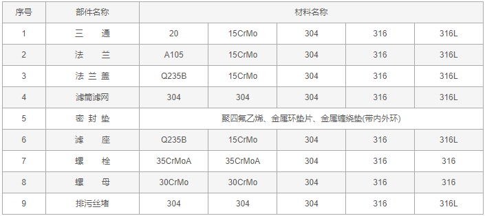 三通反折流T型過濾器零件材料: