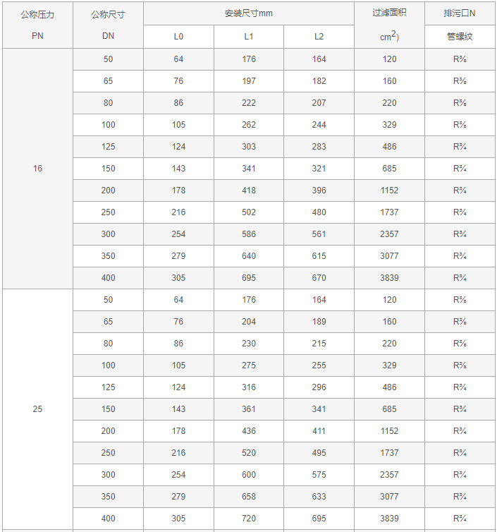 三通反折流T型過濾器外形尺寸表: