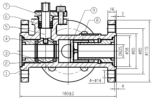 組合式三通球閥由于在高壓和低壓通道內(nèi)分別設(shè)置了球閥和止回閥密封副,通過閥桿旋轉(zhuǎn)球體將高壓通道的球閥密封副打開,高壓通道與中通通道連通,高壓介質(zhì)得以流過閥門,同時低壓通道內(nèi)的止回閥瓣在高低壓介質(zhì)的壓差作用下將低壓通道關(guān)閉,由此使得高壓通道處于開啟狀態(tài)而低壓通道處于關(guān)閉狀態(tài),經(jīng)閥桿帶動球體旋轉(zhuǎn)將高壓通道的球閥密封關(guān)閉,高壓介質(zhì)不能流過閥門,同時低壓通道內(nèi)的止回閥瓣在低壓介質(zhì)的壓力下脫離低壓閥座,使低壓介質(zhì)得以流過閥門,由此使得高壓通道處于關(guān)閉狀態(tài)而低壓通道處于開啟狀態(tài),實現(xiàn)了三通閥的目的。該閥由于將中間腔體的三通球體變?yōu)楦邏和ǖ赖亩ㄇ蝮w,并通過高壓通道的開啟和關(guān)閉控制低壓通道的關(guān)閉與開啟,當(dāng)高壓通道關(guān)閉時,高壓介質(zhì)將球體壓向閥座,壓力越大球體和該閥座之間的密封力就越大,由此避免了高壓介質(zhì)通過球閥密封副向中通通道的泄漏。本產(chǎn)品的結(jié)構(gòu)長度與傳統(tǒng)的L型三通球閥相同。