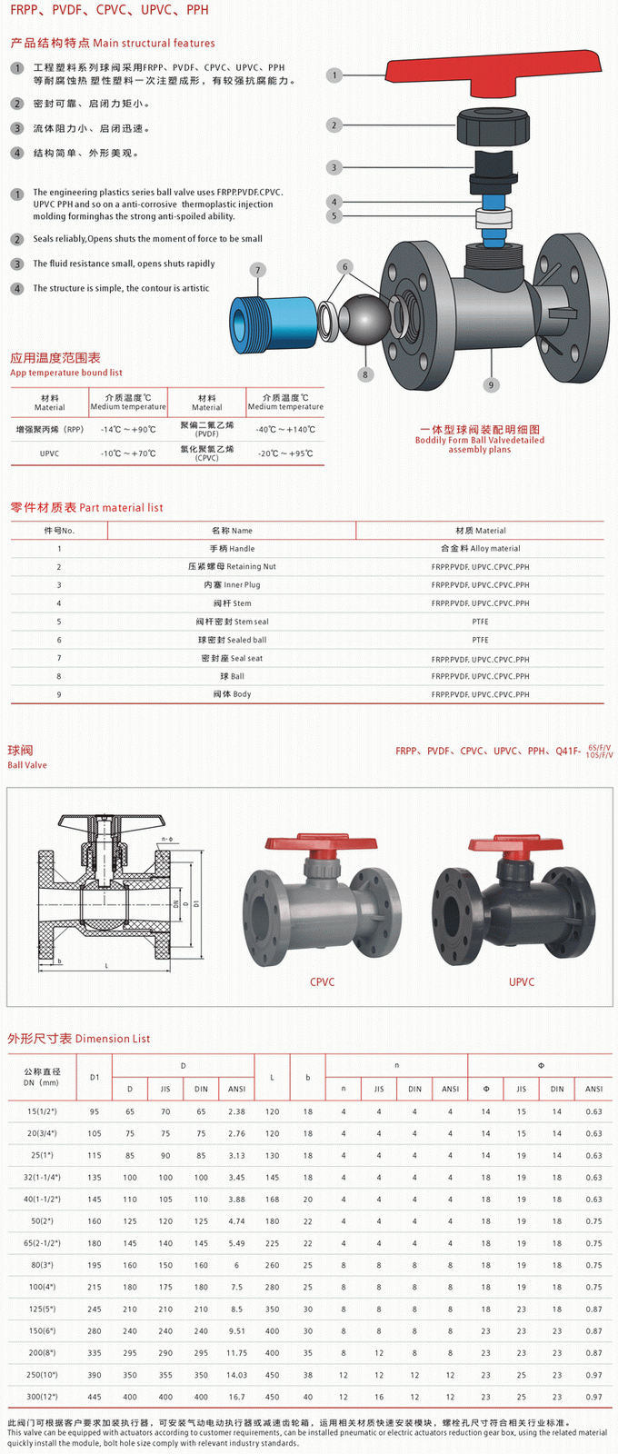 RPP,PPH,PVC,PVDF塑料球閥是公司全塑閥門系列產品,塑料球閥耐腐蝕性能優(yōu)良,密封圈采用F4,密封可靠,啟閉力矩小,流體阻力小,啟閉迅速,結構簡單,外形美觀。隨著塑料管道在冷熱給水和工業(yè)管道應用中所占比例的不斷提高,塑料閥門的質量控制越來越顯得尤其重要。由于塑料閥門所具有的質量輕、耐腐蝕、不吸附水垢、可與塑料管路一體化連接和使用壽命長的特點,其各方面應用的優(yōu)勢是其他閥門無法相比的。塑料球閥詳細資料:
