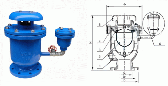 復合式高速進排氣閥是一直由閥體、浮球、大孔密封組件、閥蓋、排氣罩、小孔排氣閥以及檢修閥等主要部件組成的法蘭連接的分分體式排氣閥。其具有當首次供水或因維修處于空管充水時,能快速排盡管內(nèi)空氣并將水注滿,或在運行中因水中析出的空氣形成壓力氣囊產(chǎn)生氣阻時,小排氣孔將自動開啟排氣,杜絕管中因壓力氣囊阻礙水的流動,有效提高注水或輸水效率。