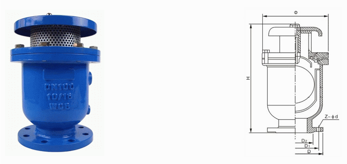 復(fù)合式快速進(jìn)排氣閥是一種由閥體、浮體、升降罩、大孔和小孔密封組件、閥蓋、排氣罩以及浮體罩和防護(hù)網(wǎng)等主要部件組成的法蘭連接的整體式帶防護(hù)網(wǎng)進(jìn)排氣閥。它設(shè)有大、小進(jìn)排氣孔,并具有管道充水時(shí)能快速排氣,管線內(nèi)產(chǎn)生負(fù)壓時(shí)又能快速進(jìn)氣,在正常工作狀態(tài)下能排出管中聚集的少量氣體,排氣后又能自動(dòng)閉閥。