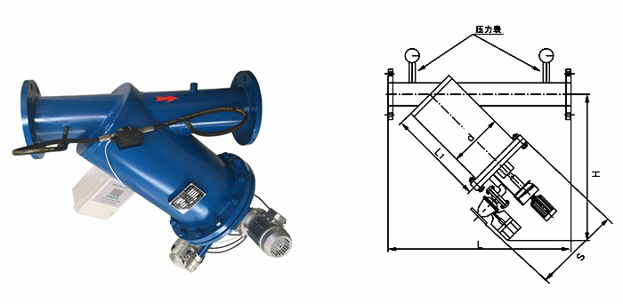 Y型電動(dòng)刷式過(guò)濾器主要由殼體、法蘭、法蘭蓋、濾筒濾網(wǎng)、壓差開(kāi)關(guān)、清洗電機(jī)、控制箱、電動(dòng)排污閥、清洗刷及內(nèi)部傳動(dòng)機(jī)構(gòu)等部件組成,其當(dāng)進(jìn)出口的壓差達(dá)到預(yù)設(shè)值或到達(dá)清洗時(shí)間、手動(dòng)預(yù)制時(shí),將開(kāi)始自動(dòng)清洗過(guò)程,整個(gè)自清洗過(guò)程包含兩個(gè)步驟:首先打開(kāi)位于過(guò)濾器上的電動(dòng)排污閥,然后電機(jī)帶動(dòng)濾網(wǎng)內(nèi)的清洗系統(tǒng),被濾網(wǎng)所攔截下來(lái)的雜質(zhì)從排污閥排出。整個(gè)清洗過(guò)程耗時(shí)可根據(jù)用戶要求設(shè)定,清洗時(shí)系統(tǒng)不斷流。
