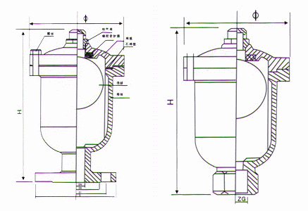 單口排氣閥主要由閥體、閥門、上蓋、閥桿、浮球、排氣嘴等組成。當(dāng)需要排出管道內(nèi)的氣體時(shí),管道內(nèi)的空氣在水的壓強(qiáng)作用下進(jìn)入體腔內(nèi),并從排氣嘴排出,隨之管道內(nèi)的水充滿體腔內(nèi),使浮球在水的浮力作用下,向上移動(dòng)將排氣嘴堵塞,達(dá)到自行密封,管道在正常行中,水中的空氣在壓強(qiáng)的作用下,不斷排入排氣閥的體腔上部,迫使浮球下降,離開原來密封位置,這時(shí)空氣又從排氣嘴排出,隨之,浮球又恢復(fù)到原來位置自密封,因此,排氣閥在正常工作中閥門始終是開著的,浮球不斷重復(fù)上述動(dòng)作,空氣不斷排出。當(dāng)需要檢修或清掃體腔時(shí),應(yīng)將閥門關(guān)閉。單口排氣閥,順時(shí)針旋轉(zhuǎn)閥桿時(shí)為關(guān)閉。