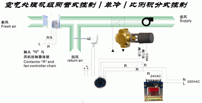 3、冬季制熱:當(dāng)溫度傳感器檢測到室內(nèi)溫度低于溫度控制器設(shè)定的溫度時(shí),電動(dòng)調(diào)節(jié)閥開啟,流量增大,反之,當(dāng)溫度傳感器檢測到的室內(nèi)溫度高于溫度控制器設(shè)定的溫度時(shí),閥門關(guān)閉,流量減小。圖中R觸頭組可與風(fēng)機(jī)連鎖,當(dāng)風(fēng)機(jī)啟動(dòng)時(shí)新風(fēng)風(fēng)門打開,溫度控制器電源被接通,整個(gè)系統(tǒng)受控;當(dāng)切斷風(fēng)機(jī)電源時(shí),風(fēng)機(jī)停轉(zhuǎn),新風(fēng)風(fēng)門關(guān)閉。