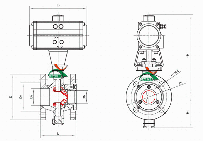 氣動(dòng)帶手動(dòng)V型球閥外形結(jié)構(gòu)圖: