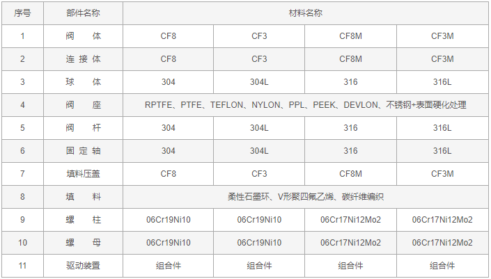 不銹鋼固定式球閥閥體、連接體、閥桿、球體或閥座等主要零部件采用不銹鋼CF8、CF3、CF8M、CF3M等鑄件或304、304L、316、316L等棒材及鍛件毛坯加工而成。該閥按密封型式分為非金屬密封和金屬硬密封兩種,非金屬密封閥座材料通常選用RPTFE、PTFE、TEFLON、NYLON、PPL、PEEK及DEVLON等,而金屬硬密封不銹鋼固定球閥的球體和閥座則采用不銹鋼材料,并在其表面進行硬化處理。