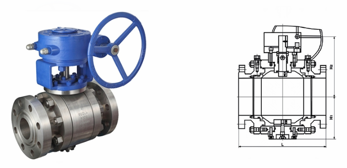 高壓球閥為三片式閥體結(jié)構(gòu),左右側(cè)蓋通過(guò)螺栓固定在中體兩側(cè),閥體的內(nèi)部開(kāi)設(shè)有流體通道,并在側(cè)蓋內(nèi)壁設(shè)有鏤空的閥座,閥座的里面放置有球體,球體的頂部有閥桿,驅(qū)動(dòng)裝置帶動(dòng)閥桿作90°旋轉(zhuǎn),以達(dá)到切斷或接通高壓管路介質(zhì)。該閥中體可以按常規(guī)鍛造工藝,在自由鍛錘上馬架擴(kuò)孔,也可采用厚壁無(wú)縫結(jié)構(gòu)鋼管,其兩側(cè)蓋實(shí)際上是一個(gè)形狀類似于標(biāo)準(zhǔn)的對(duì)焊法蘭,而對(duì)于法蘭連接端的該閥,主要是采用鍛焊結(jié)構(gòu),即在對(duì)焊端的左右側(cè)蓋上分別再焊上一個(gè)對(duì)焊法蘭。