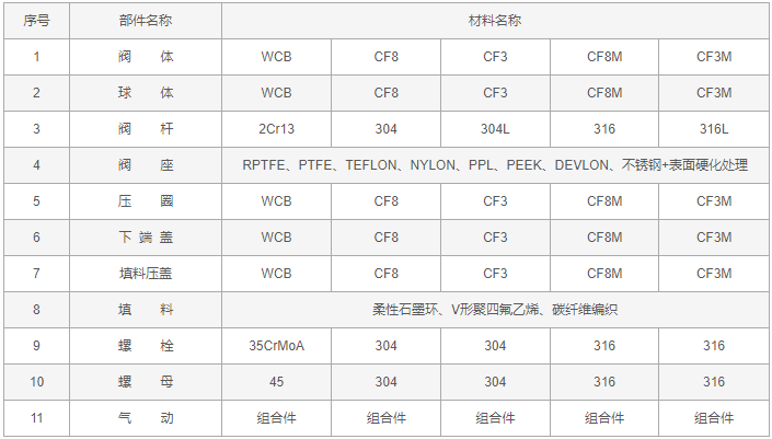 氣動V型球閥零件材料: