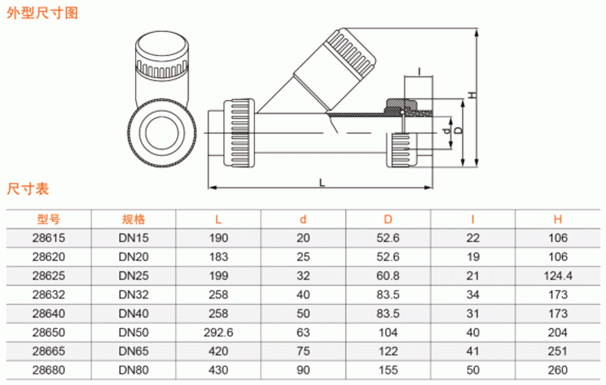 CPVC塑料Y型過濾器外形結(jié)構(gòu)及連接尺寸:
