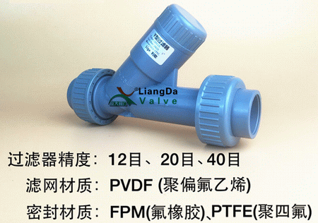 塑料Y型過濾器是輸送介質(zhì)的管道上不可缺缺少的一種裝置,通常安裝在減壓閥、泄壓閥、定水位閥或其他設(shè)備進(jìn)口端。塑料Y型過濾器用來消除介質(zhì)種的雜質(zhì),以保護(hù)閥門、水泵以及設(shè)備的正常使用。塑料Y型過濾器主要適用余化工、石油、冶金、輕工、醫(yī)藥、食品等行業(yè)的液體及氣體物料的過濾。