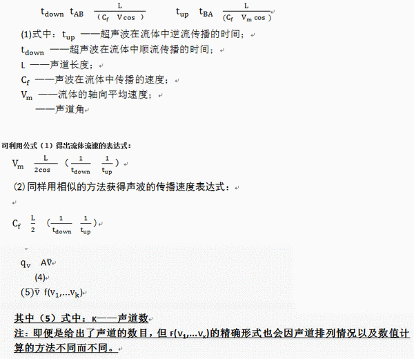 流量計(jì)以測(cè)量聲波在流動(dòng)介質(zhì)中傳播的時(shí)間與流量的關(guān)系為原理。通常認(rèn)為聲波在流體中的實(shí)際傳播速度是由介質(zhì)靜止?fàn)顟B(tài)下聲波的傳播速度和流體軸向平均流速在聲波傳播方向上的分量組成。如下示意圖所示,順流和逆流傳播時(shí)間與各量之間的關(guān)系是: