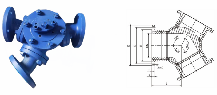 120度Y型三通球閥外形結(jié)構(gòu)圖: